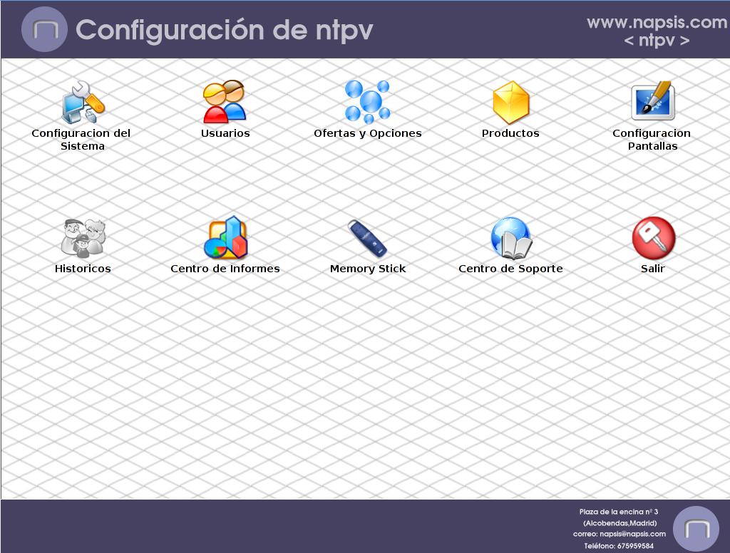 En esta pantalla se muestra información de cómo contactar con Napsis y de algunos de los servicios asociados a nTPV.